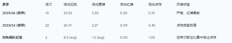根据2025/26赛季的最新数据,希格勒在执法的10场荷甲联赛中出示了33张黄牌,场均3.3张,同时已经出示了3张红牌,这一红牌率位居联盟前列 。对于前进之鹰而言,由于瑙伯和桑普斯特德的缺阵,他们不得不使用的替补防线在防守位置感和选位上可能存在严重不足,这将极大增加他们在禁区内通过犯规来弥补失位的概率。希格勒在本赛季的场均犯规判罚数达到23.3次,历史上的点球判罚频率更是高达每场0.45个(2023/24赛季数据) 。